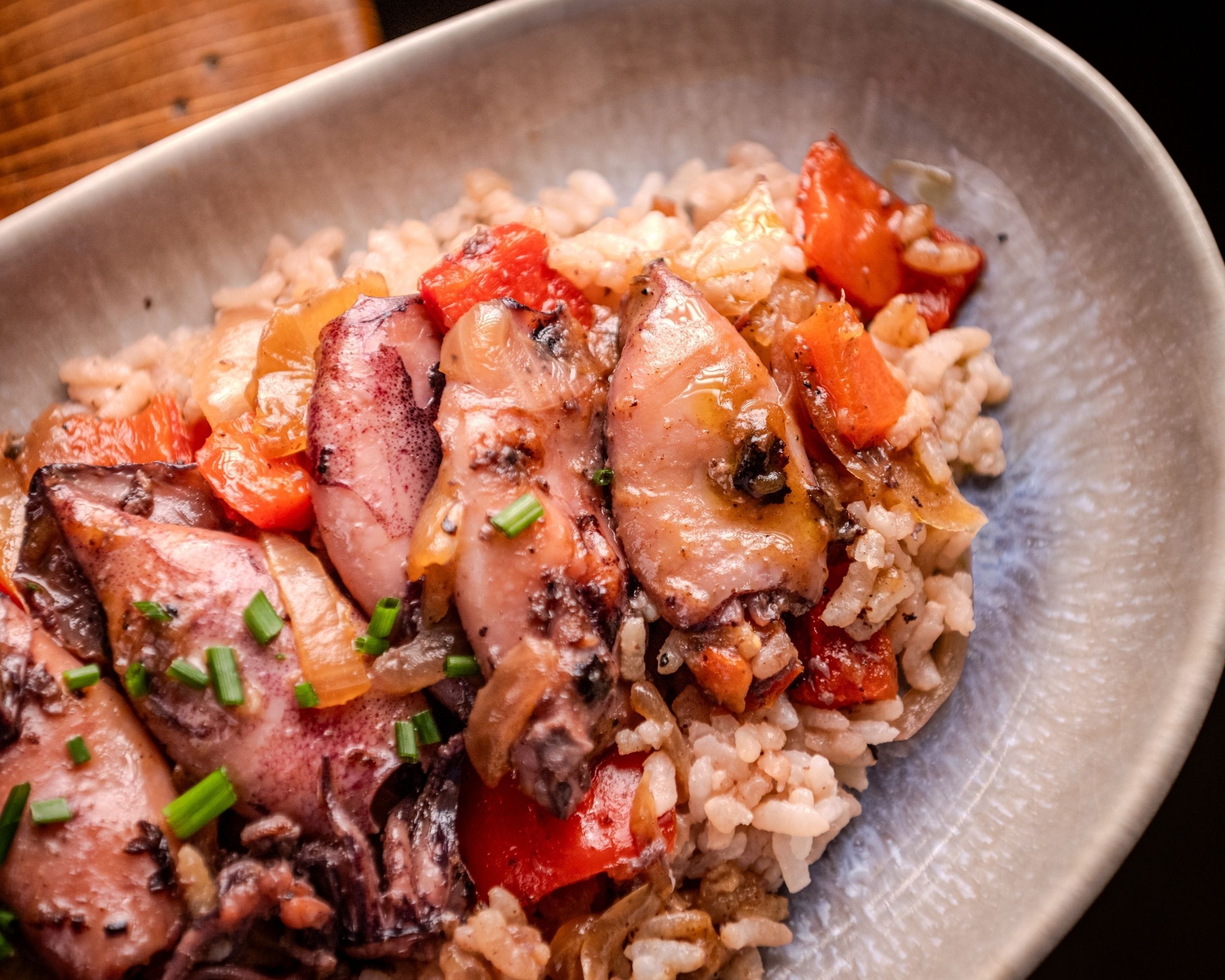 Chipirones frescos cocinados lentamente con cebolla, pimientos y un toque de brandy. Servidos con arroz blanco, conservan todo su sabor marinero y la suavidad de una receta tradicional.